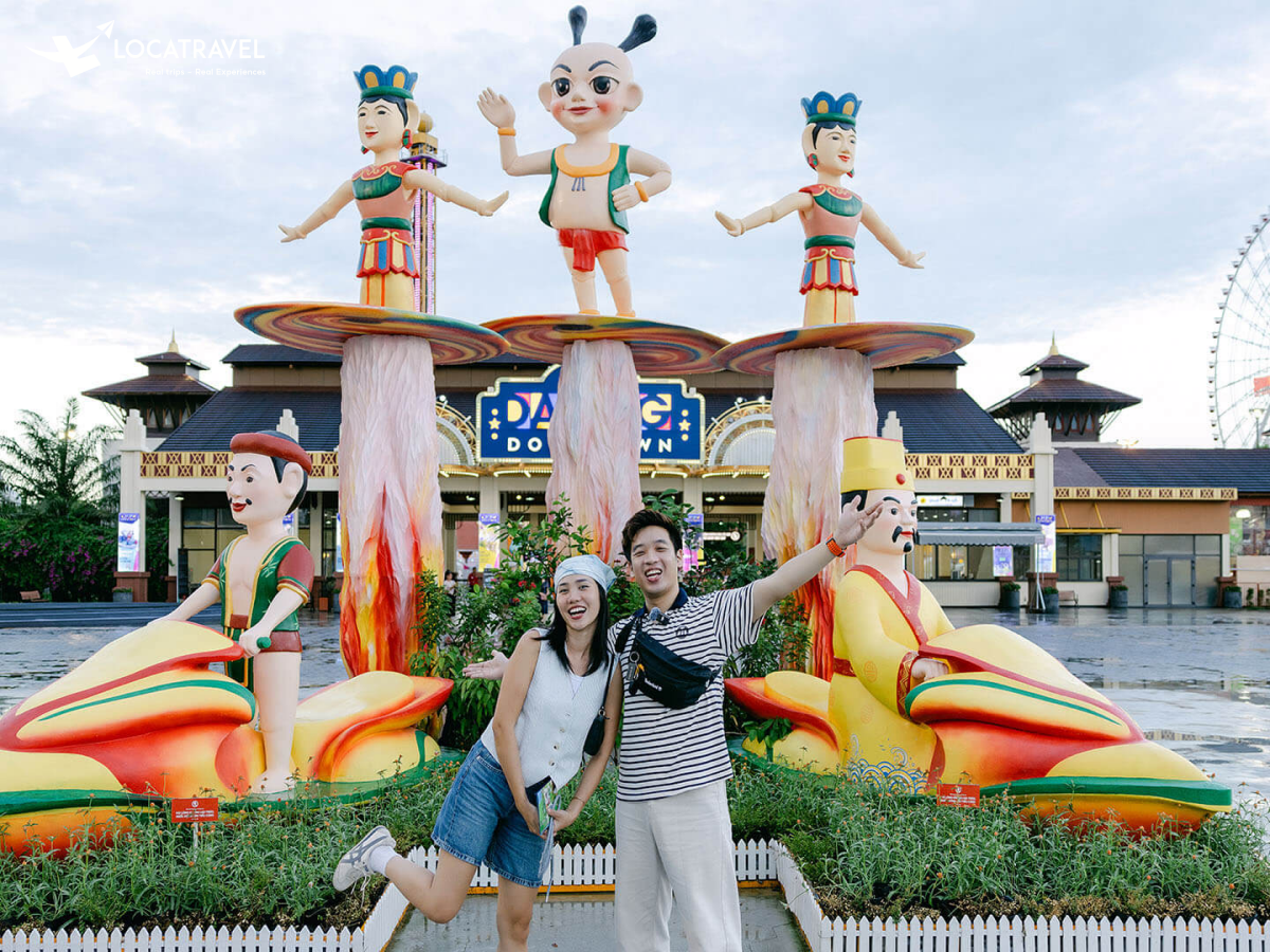 Không chỉ show Symphony of River, du khách đến Da Nang Downtown còn để tìm kiếm một góc check in rất “thuần Việt”. Đó là tiểu cảnh Rối Việt tại cổng chào của tổ hợp vui chơi giải trí. Những nhân vật đặc trưng của nghệ thuật rối Việt như chú Tễu, nàng Tiên, người nông dân được thiết kế lại ngộ nghĩnh và độc đáo. Đặc biệt, đây cũng là nơi có 1-0-2 khi bạn có thể check in mô hình rối Việt cưỡi Jetski - đặc trưng của show diễn Awaken River và Symphony of River tại Da Nang Downtown.