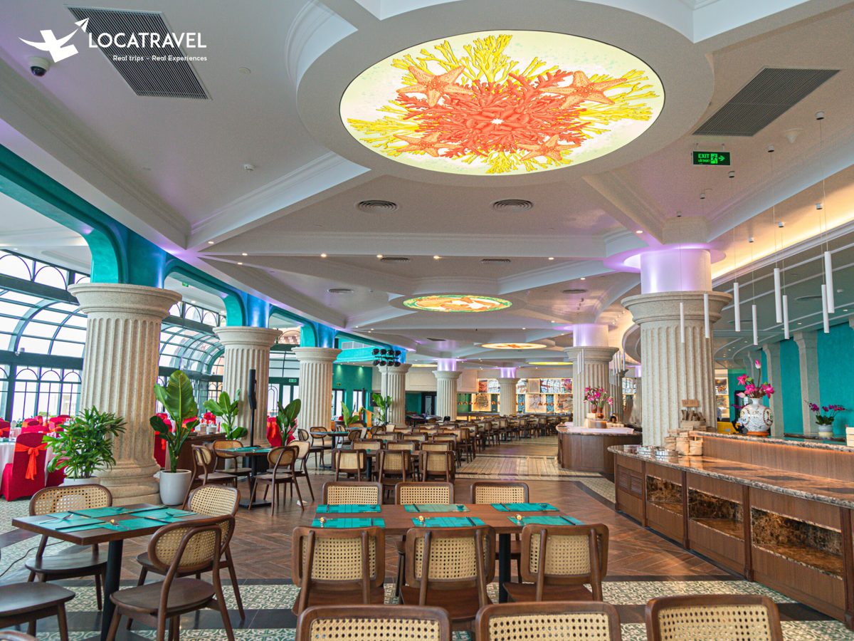 Bốn Mùa – Four Seasons là nhà hàng buffet độc đáo nằm trên đỉnh Bà Nà Hills, mang đến cho thực khách một hành trình ẩm thực đa quốc gia giữa khung cảnh thiên nhiên tuyệt đẹp. Không gian nơi đây được thiết kế hài hòa với gam màu xanh – trắng chủ đạo, tạo cảm giác dịu nhẹ, thư thái và gần gũi với thiên nhiên. Mỗi tầng trong ba tầng của nhà hàng đều có công năng riêng biệt, từ khu buffet Á – Âu phong phú đến tầng riêng phục vụ cà phê và bánh ngọt, giúp mỗi trải nghiệm đều trở nên trọn vẹn.
